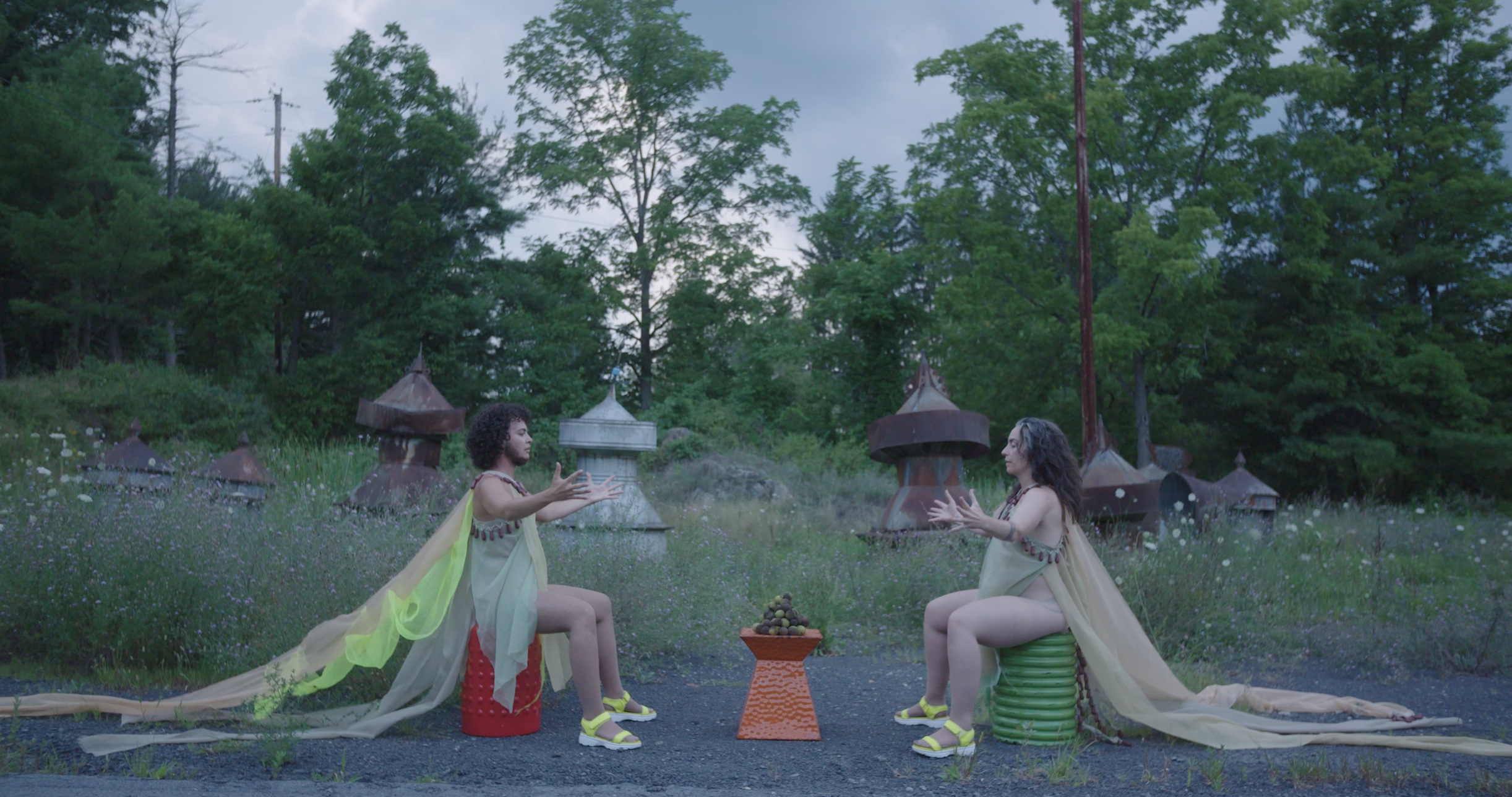 “Land/Escapes” was shot entirely in a two-week process on residency in the Catskills and was directed, filmed, and edited by Julia C Liu. Zavé and J co-conceptualized, co-choreographed, co-wrote, and performed alongside one another in the film. In a collective process, J, Julia, and Zavé co-created storyboards and planned production. Zavé designed and constructed the costumes and recorded field sound recordings that pepper the film’s soundscape. The post-production process was also approached collectively with an expanded team — musician Aviva Jaye joined Julia, J, and Zavé to compose songs for the film’s soundtrack and perform in voice as an omniscient narrator. Folding in Aviva’s music, vocals, and song-writing, the artists continued and grew conversations about their settler/occupier positions on unceded Lenapehoking, Canarsie, Narragansett, and Wampanoag territories.