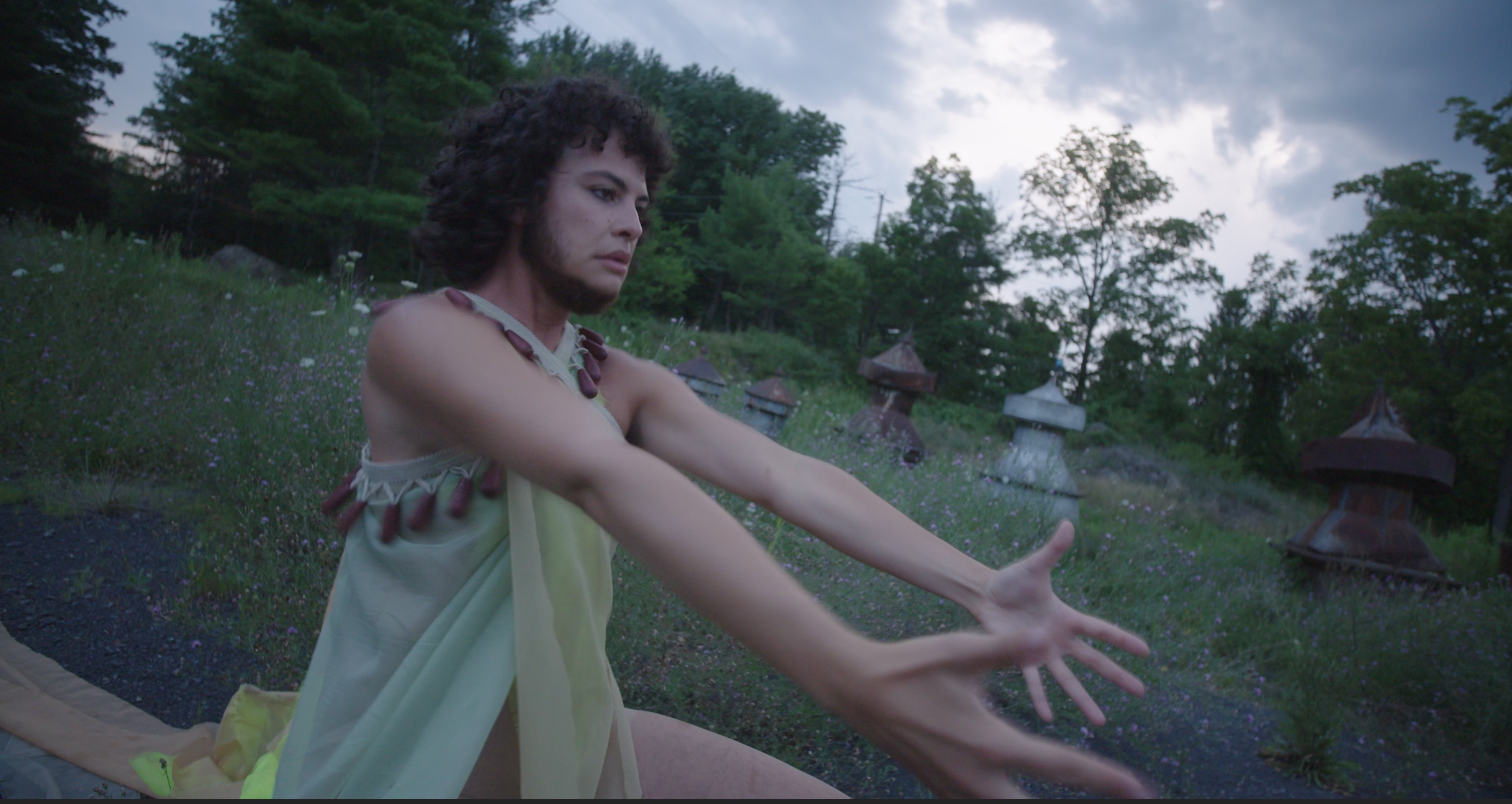 “Land/Escapes” was shot entirely in a two-week process on residency in the Catskills and was directed, filmed, and edited by Julia C Liu. Zavé and J co-conceptualized, co-choreographed, co-wrote, and performed alongside one another in the film. In a collective process, J, Julia, and Zavé co-created storyboards and planned production. Zavé designed and constructed the costumes and recorded field sound recordings that pepper the film’s soundscape. The post-production process was also approached collectively with an expanded team — musician Aviva Jaye joined Julia, J, and Zavé to compose songs for the film’s soundtrack and perform in voice as an omniscient narrator. Folding in Aviva’s music, vocals, and song-writing, the artists continued and grew conversations about their settler/occupier positions on unceded Lenapehoking, Canarsie, Narragansett, and Wampanoag territories.